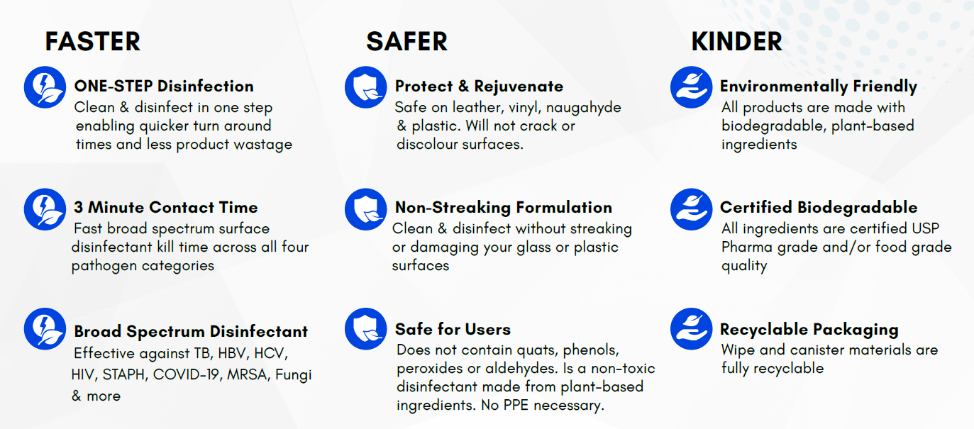 BioTEXT is the only ready-to-use broad spectrum hospital and food grade clinical disinfectant wipe specifically formulated for use on delicate or irregular surfaces. It is proven to kill benchmark organisms on Naugahyde, leather, vinyl, plastic and rubber surfaces. Ideal for tubing, fabrics, carpets, chairs and other high touch surfaces such as keyboards and glass touch screen devices. BioTEXT has a pleasant fresh scent.